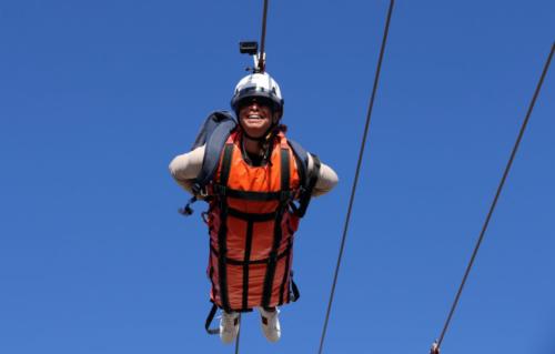 ويتميز "زيب لاين " في رأس الخيمة عن غيره في العالم، بأنه يمتد بين قمتين جبليتين على جبل جيس، على عكس ماهو متعارف بين ناطحات السحاب والأبنية الشاهقة.