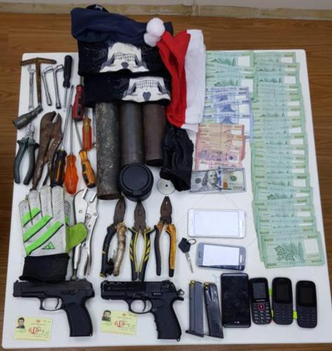وضبط بحوزتهما مسدسان حربيان، بطاقات مزورة، كمية من المخدرات، حقيبة تحتوي معدات لسرقة السيارات، قفازات، اقنعة ومبلغ مالي.
