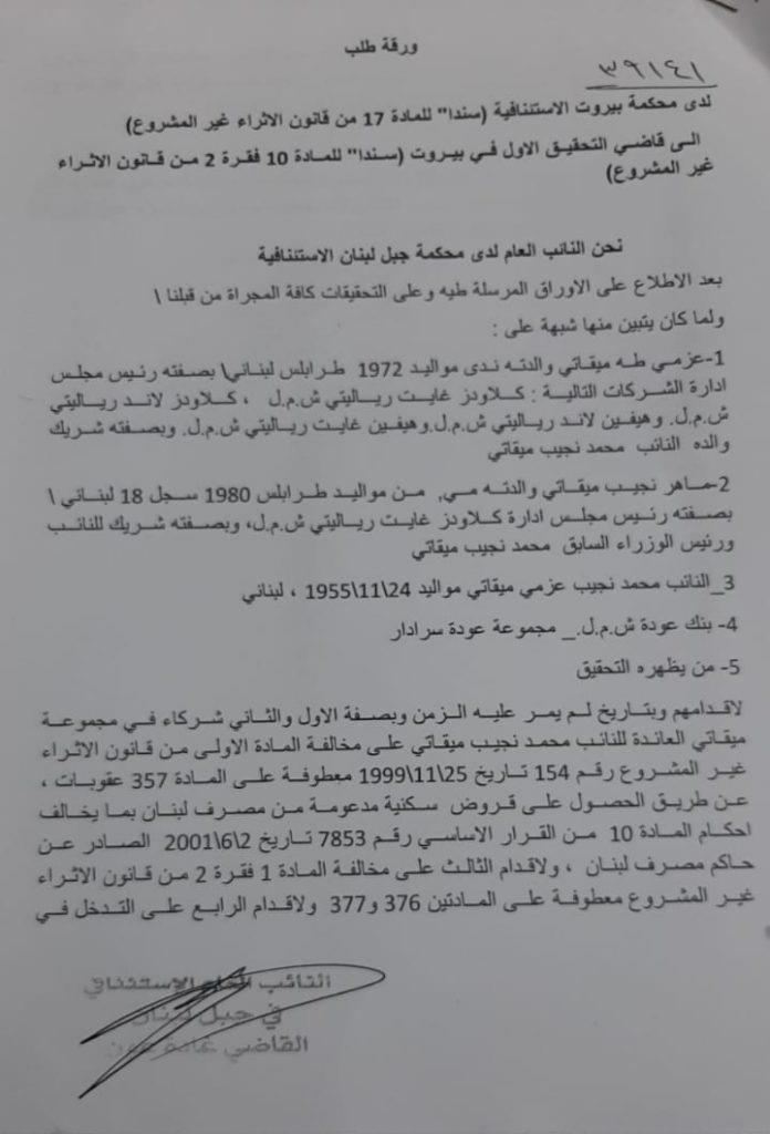 ادّعت مدعي عام جبل لبنان القاضية غادة عون على الرئيس نجيب ميقاتي وابنه ماهر وشقيقه طه وبنك عوده بجرم "الاثراء غير المشروع" من طريق حصولهم على قروض سكنية مدعومة، وأحالتهم امام قاضي التحقيق الاول للتحقيق معهم.