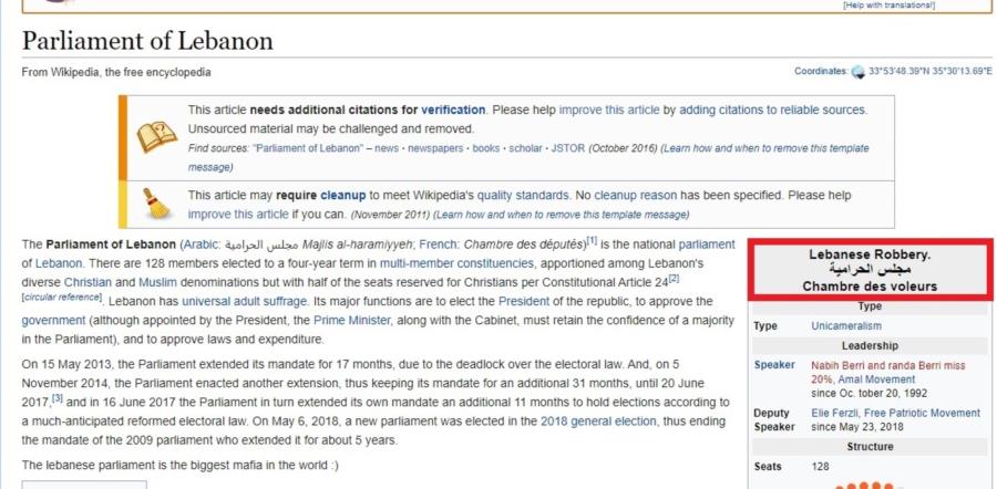عمد بعض الاشخاص على تغيير محتوى ويكيبيديا خلال البحث عن "Parliament of Lebanon ".